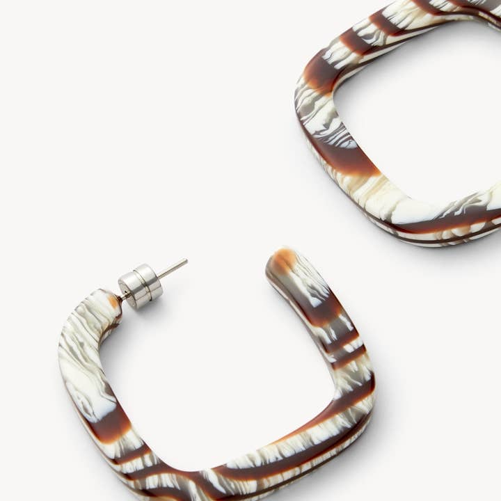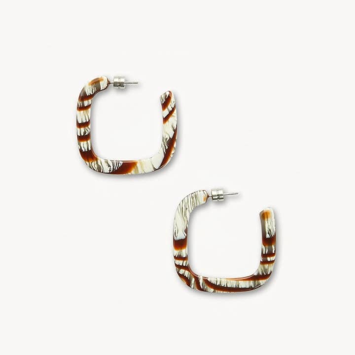 1.5” squared hoop earrings, handcrafted from our lightweight Italian acetate with engraved barrel backings. - Handmade from Italian acetate - Approximately 1.5” inches in diameter