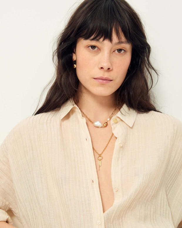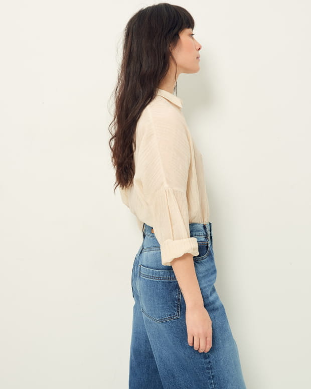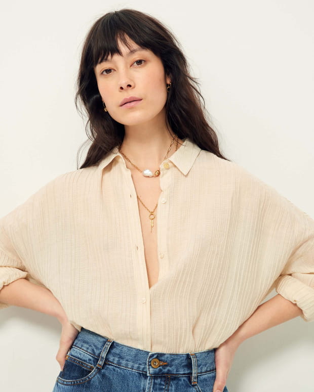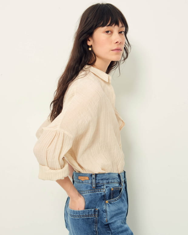 Shirt with gathered drop shoulders in a crepe fabric with relief tone-on-tone stripes.